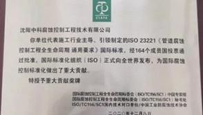 2020年11月3日,由沈阳中科腐蚀控制工程技术有限公司联合主导编制的国际标准ISO 23221《Pipeline Corrosion Control Engineering Life Cycle — General Requirements》(管道腐蚀控制工程全生命周期 通用要求)由ISO正式发布。